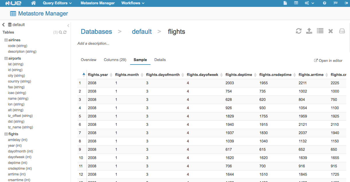 For this demo, we have created and populated 3 tables in Hive. The table names are: flights, airlines and airports. Using Hue, we can see the loaded tables. For the links to the data files and their Hive import scripts please see Appendix A.