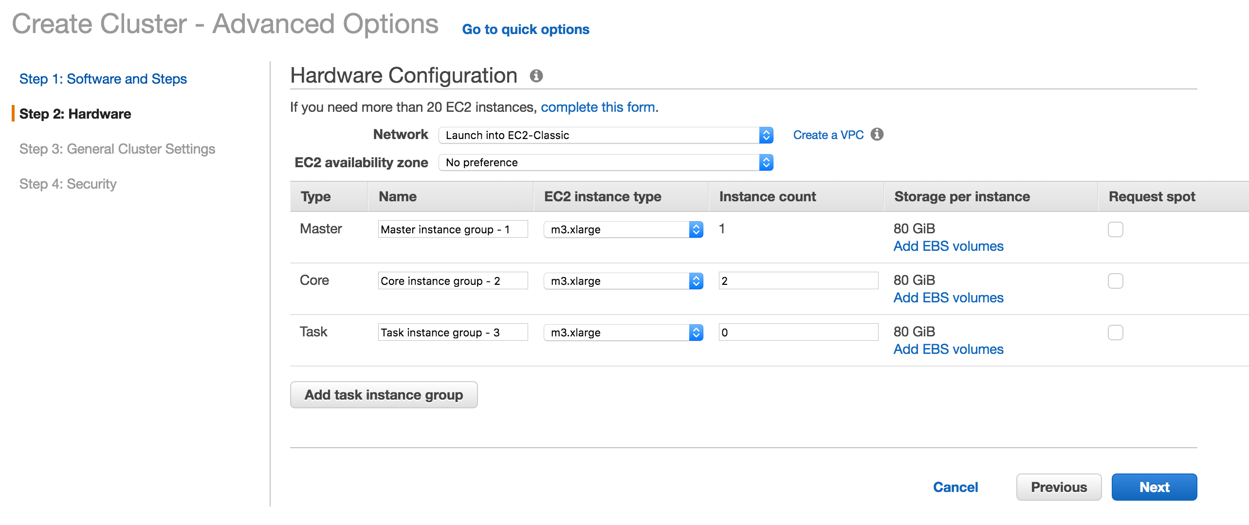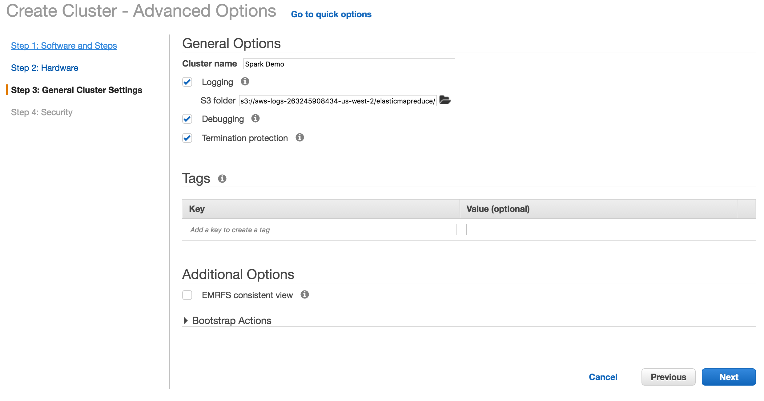 This demonstration uses Amazon Web Services (AWS), but it could just as easily use Microsot, Google, or any other provider. We will use Elastic Map Reduce (EMR) to easily set up a cluster with two core nodes and one master node. Nodes use virtual servers from the Elastic Compute Cloud (EC2). Note: There is no free tier for EMR, charges will apply.