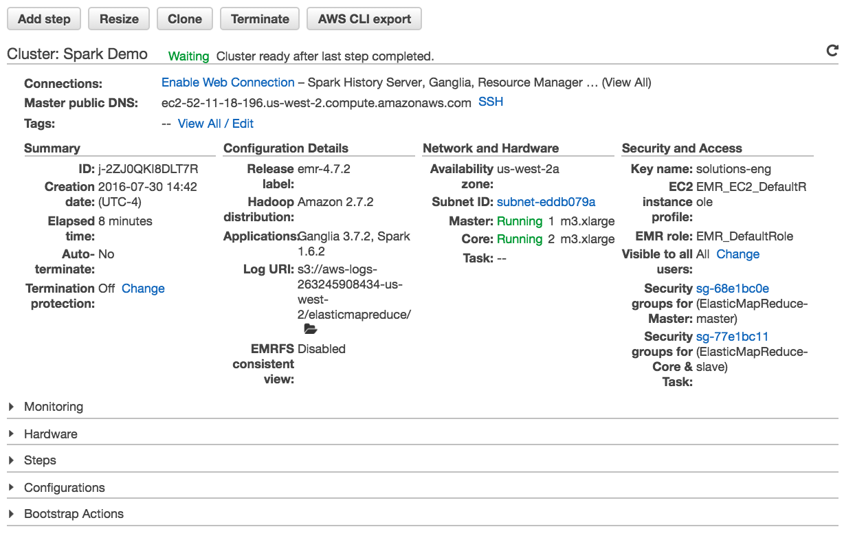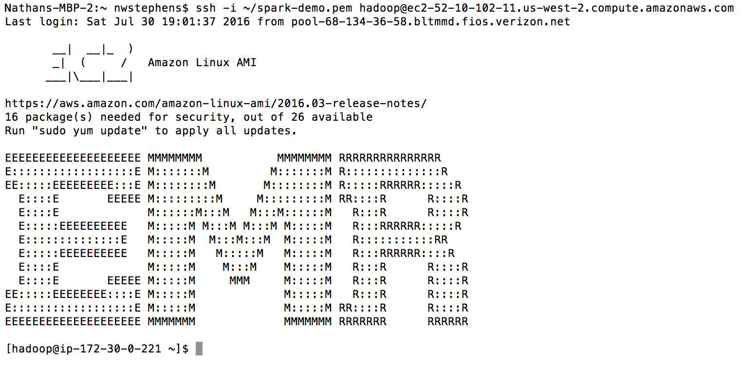 ssh -i ~/spark-demo.pem hadoop@ec2-52-10-102-11.us-west-2.compute.amazonaws.com