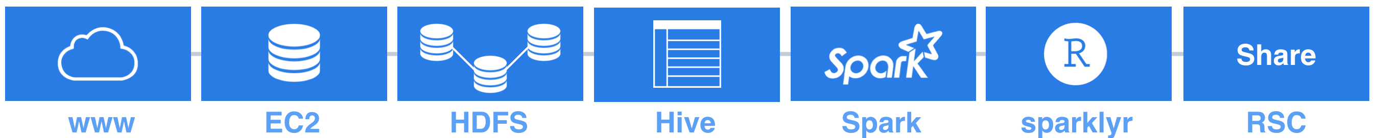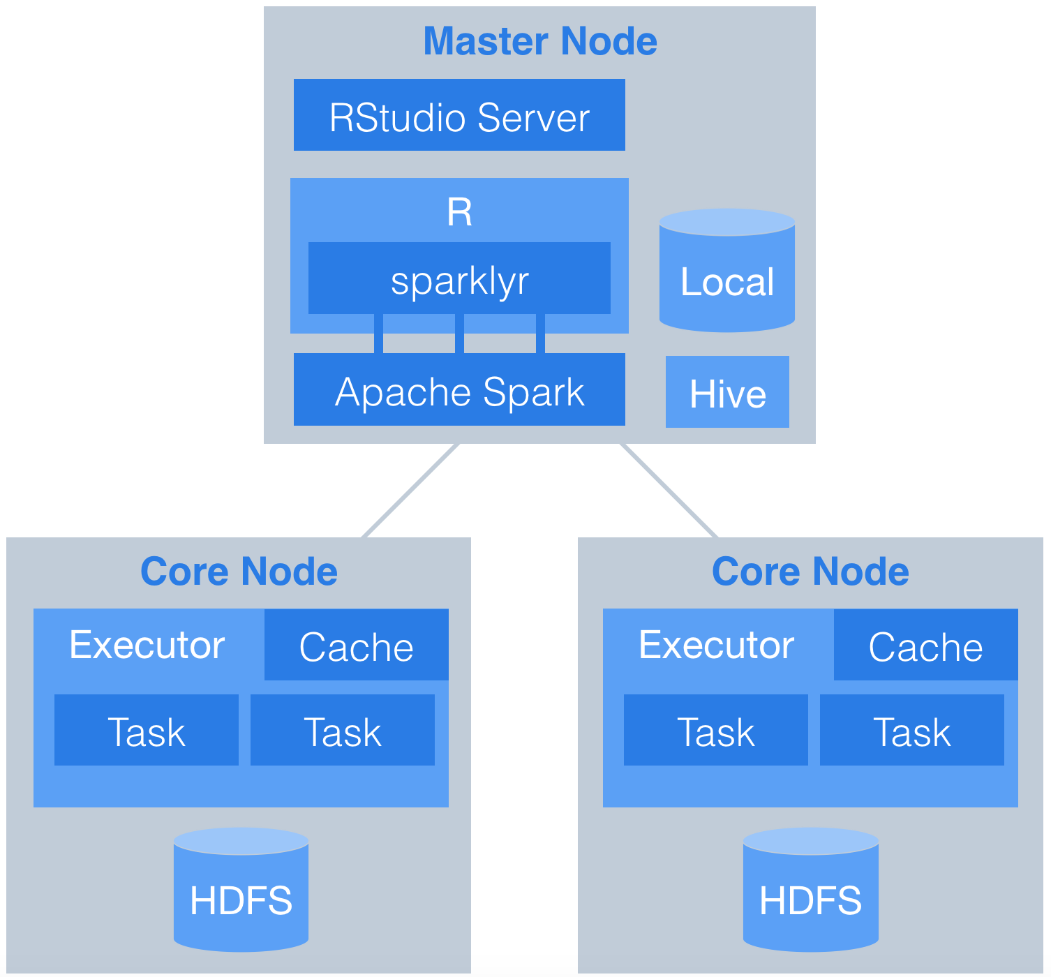 This document demonstrates how to use sparklyr with an Apache Spark cluster. Data are downloaded from the web and stored in Hive tables on HDFS across multiple worker nodes. RStudio Server is installed on the master node and orchestrates the analysis in spark. Here is the basic workflow.