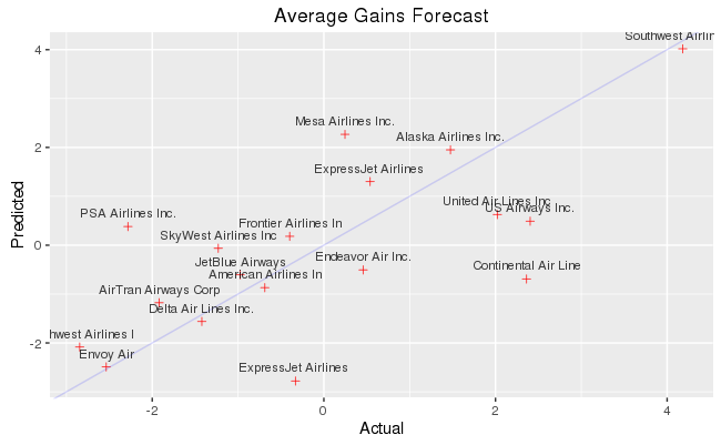 # Plot actual gains and predicted gains by airline carrier