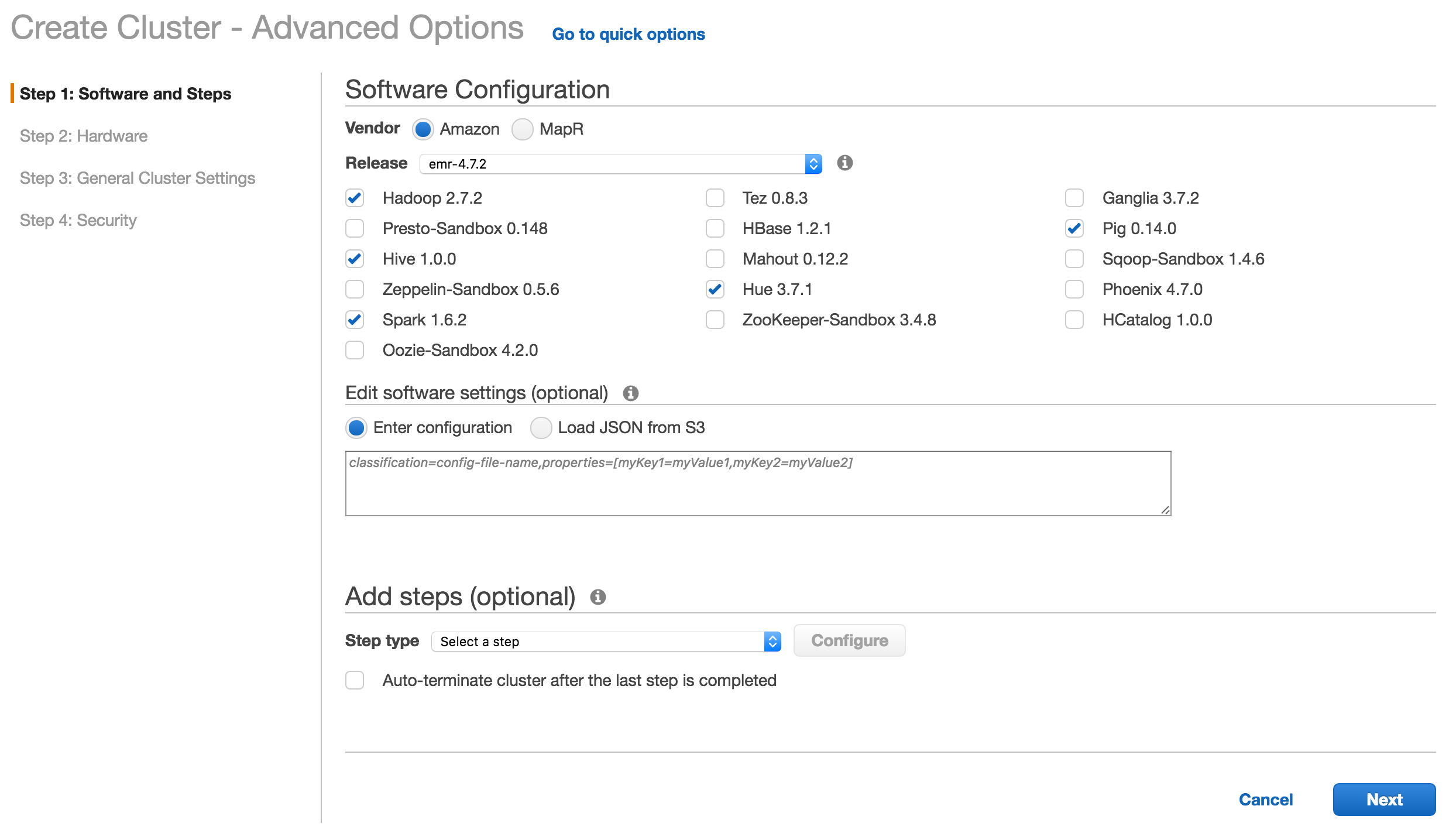 Make sure to select Hive and Spark as part of the install. Note that by choosing Spark, R will also be installed on the master node as part of the distribution.