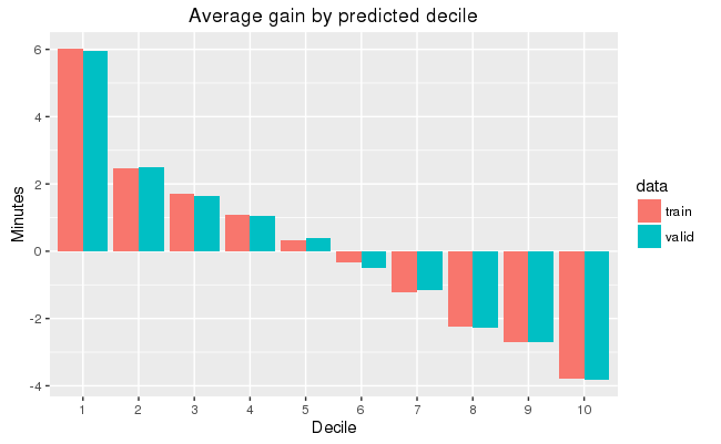 labs(title = 'Average gain by predicted decile', x = 'Decile', y = 'Minutes')